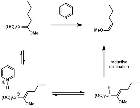 If the side chain of Fischer carbene bears an α-proton, it could be reversibly deprotonated with a weak base such as pyridine. This facilitates formation of chromium hydride species, which can undergo reductive elimination to give a cis-enol ether.[17]