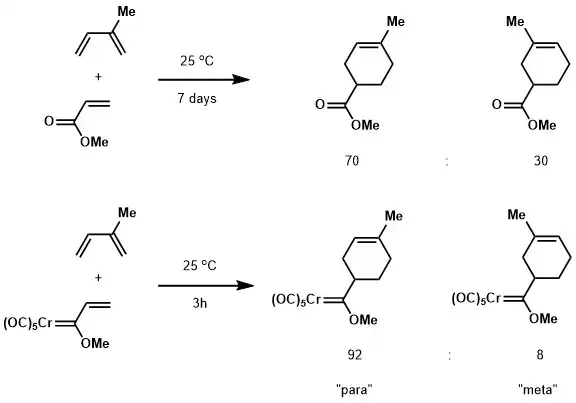 The strong electron withdrawing nature of Fischer carbenes is also reflected in many reactions. For instance, the Diels–Alder reaction between methyl acrylate and isoprene is completed in 7 days at room temperature with low para-meta selectivity. On the other hand, the Fischer carbene counterpart finished in 3 hours at room temperature with much higher para-meta selectivity.[10]