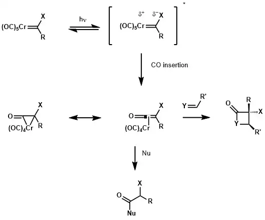 The UV-Vis spectrum of a Fischer carbene shows a metal-to-ligand charge transfer band in the near ultraviolet. On the one hand, this excitation promotes an electron from a metal centered orbital to a ligand centered orbital, making the carbene carbon more electron rich. On the other hand, the metal centre, already electron poor because of the carbonyl ligands, becomes more electron poor, facilitating migratory insertion to the CO ligand. This migratory insertion gives a chromium metallacyclopropanone, which is a resonance form of the metallated ketene. With ketene reactivity, the species could be trapped by several nucleophiles such as alcohols and amines, or could react in [2+2] cycloaddition with alkenes, imines, or aldehyde yielding the corresponding cyclobutane, β-lactam, and β-lactone adducts.[18]