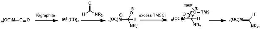 Fischer carbenes with an α-hydrogen are prepared by reaction of a metal carbonyl anion with a formamide. Treating the intermediate with excess amount of trimethylsilyl chloride yields this particular group of Fischer carbene complex.[5]