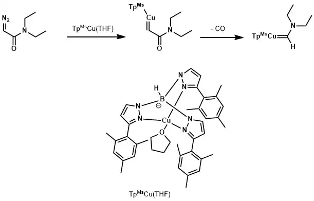- ↑ Álvarez, María; Besora, Maria; Molina, Francisco; Maseras, Feliu; Belderrain, Tomás R.; Pérez, Pedro J. (2021-03-31). "Two Copper-Carbenes from One Diazo Compound". Journal of the American Chemical Society. 143 (12): 4837–4843. doi:10.1021/jacs.1c01483. hdl:10272/19704. PMID 33733762.