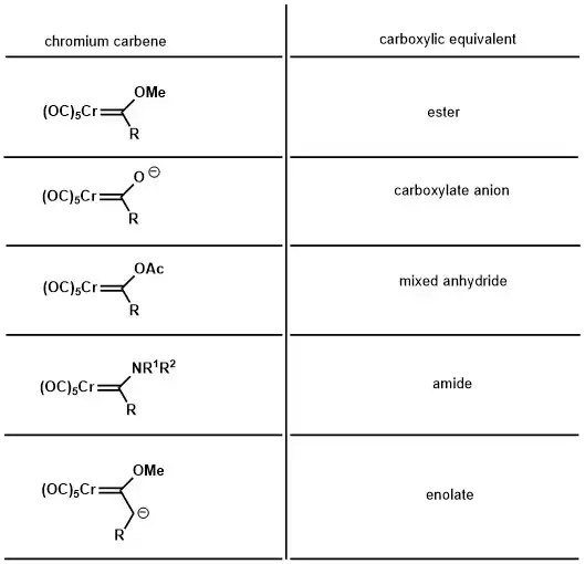 The carbene carbon of a Fischer carbene is electrophilic in nature. Thus, Fischer carbenes exhibit similar reactivity compared to carbonyl compounds. Many of the reactions can be understood by using the carboxylic equivalent structure such as transesterification, Michael addition, and aldol reaction. The Cr(CO)5 moiety is a strong electron withdrawing group making the α-proton highly acidic. A methoxy chromium carbene with a methyl side chain has a pKa of 12.5 in aqueous acetonitrile (1:1 volume ratio).[8][9] For comparison, methyl acetate has a pKa of 25.6, demonstrating the strong electron withdrawing nature of the Cr(CO)5 moiety.