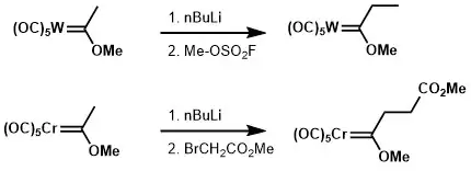 The enolate-like structure, obtaining by deprotonation of Fischer carbene, could be alkylated. However, because the carbanion is highly stabilized, a reactive alkylating reagent, such as methyl fluorosulfonate ("magic methyl" reagent) or methyl bromoacetate is needed.[12][13]