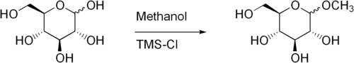 Fischer glycosidation of glucose to produce methyl glucoside using trimethylsilylchloride as catalyst.[4]