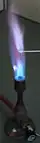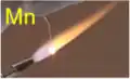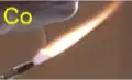 A flame test involves introducing a sample of the element or compound to a hot, non-luminous flame and observing the color of the flame that results.[4] The compound can be made into a paste with concentrated hydrochloric acid, as metal halides, being volatile, give better results.[5] Different flames can be tried to verify the accuracy of the color. Wooden splints, Nichrome wires, platinum wires, magnesia rods, cotton swabs, and melamine foam are suggested for support.[6][7][8] Safety precautions are crucial due to the flammability and toxicity of some substances involved.[9][10][11][6] When using a splint, one must be careful to wave the splint through the flame rather than holding it in the flame for extended periods, to avoid setting the splint itself on fire. The use of a cotton swab or melamine foam (used in “eraser” cleaning sponges) as a support has also been suggested.[7][8][6] Sodium is a common component or contaminant in many samples,[2] and its spectrum tends to dominate many flame tests others.[5] The test flame is often viewed through cobalt blue glass to filter out the yellow of sodium and allow for easier viewing of other metal ions.