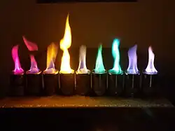 A flame test is relatively quick test for the presence of some elements in a sample. The technique is archaic and of questionable reliability, but once was a component of qualitative inorganic analysis. The phenomenon is related to pyrotechnics and atomic emission spectroscopy.[1] The color of the flames is understood through the principles of atomic electron transition and photoemission, where varying elements require distinct energy levels (photons) for electron transitions.[2][3]