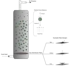 Typically, pressurized gas or liquid enters the fluidised bed vessel through numerous holes via a plate known as a distributor plate, located at the bottom of the fluidised bed. The fluid flows upward through the bed, causing the solid particles to be suspended. If the inlet fluid is disabled, the bed may settle, pack onto the plate or trickle down through the plate. Many industrial beds use a sparger distributor instead of a distributor plate. The fluid is then distributed through a series of perforated tubes.