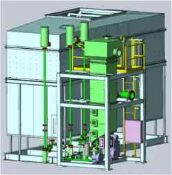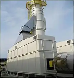 Industrial processes requiring ventilation, including paint booths,[2] printing, and chemical production, exhaust the ventilated air to the fluidized bed concentrator at room temperature.[3] The air first passes into the adsorption tower, where it moves through six perforated trays of clean carbon beads. The 0.7 mm bead activated carbon (BAC) fluidizes in the trays and captures the VOCs as they intermix.