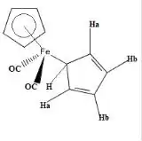 At 30 °C, the 1H NMR spectrum shows only two peaks, one typical (δ5.6) of the η5-C5H5 and the other assigned η1-C5H5. The singlet assigned to the η1-C5H5 ligand splits at low temperatures owing to the slow hopping of the Fe center from carbon to carbon in the η1-C5H5 ligand.[16] Two mechanisms have been proposed, with the consensus favoring the 1,2 shift pathway.[17]