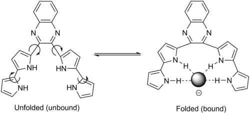 Abiotic foldamers are again organic molecules designed to exhibit dynamic folding. They exploit a few known key intermolecular interactions, as optimized by their design. One example is oligopyrroles that organize upon binding anions like chloride through hydrogen bonding (see figure). Folding is induced in the presence of an anion: the polypyrrole groups have little conformational restriction otherwise.[17][18]