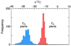 The product 3-phosphoglycerate is depleted in 13C due to the kinetic isotope effect of the above reaction. The overall 13C fractionation for C3 photosynthesis ranges between -20 and -37‰.[2]