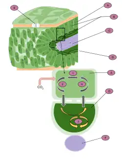 Plants that use Crassulacean acid metabolism, also known as CAM photosynthesis, temporally separate their chemical reactions between day and night. This strategy modulates stomatal conductance to increase water-use efficiency, so is well-adapted for arid climates.[28] During the night, CAM plants open stomata to allow CO2 to enter the cell and undergo fixation into organic acids that are stored in vacuoles. This carbon is released to the Calvin cycle during the day, when stomata are closed to prevent water loss, and the light reactions can drive the necessary ATP and NADPH production.[29] This pathway differs from C4 photosynthesis because CAM plants separate carbon by storing fixed CO2 in vesicles at night, then transporting it for use during the day. Thus, CAM plants temporally concentrate CO2 to improve RuBisCO efficiency, whereas C4 plants spatially concentrate CO2 in bundle sheath cells. The distribution of plants which use CAM photosynthesis includes epiphytes (e.g., orchids, bromeliads) and xerophytes (e.g., succulents, cacti).[30]