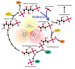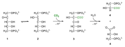 The large fractionation of 13C in photosynthesis is due to the carboxylation reaction, which is carried out by the enzyme ribulose-1,5-bisphosphate carboxylase oxygenase, or RuBisCO.[5] RuBisCO catalyzes the reaction between a five-carbon molecule, ribulose-1,5-bisphosphate (abbreviated as RuBP) and CO2 to form two molecules of 3-phosphoglyceric acid (abbreviated as PGA). PGA reacts with NADPH to produce 3-phosphoglyceraldehyde.[4]