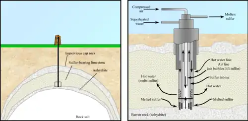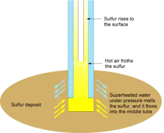 In the Frasch process, three concentric tubes are introduced into the sulfur deposit. Superheated water (165 °C, 2.5-3 MPa) is injected into the deposit via the outermost tube. Sulfur (m.p. 115 °C) melts and flows into the middle tube. Water pressure alone is unable to force the sulfur into the surface due to the molten sulfur's greater density, so hot air is introduced via the innermost tube to froth the sulfur, making it less dense, and pushing it to the surface.[1]