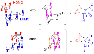 In terms of the stereoselectivity of the reaction between maleic anhydride and cyclopentadiene, the endo-product is favored, a result best explained through FMO theory. The maleic anhydride is an electron-withdrawing species that makes the dieneophile electron deficient, forcing the regular Diels–Alder reaction. Thus, only the reaction between the HOMO of cyclopentadiene and the LUMO of maleic anhydride is allowed. Furthermore, though the exo-product is the more thermodynamically stable isomer, there are secondary (non-bonding) orbital interactions in the endo- transition state, lowering its energy and making the reaction towards the endo- product faster, and therefore more kinetically favorable. Since the exo-product has primary (bonding) orbital interactions, it can still form; but since the endo-product forms faster, it is the major product.[2]