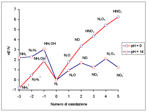 Note: as not all chemical species are necessarily indicated on a given Frost diagram, these diagrams can easily exhibit significant differences: e.g., this diagram does not show hydrazine (NH2-NH2), also a quite unstable compound and the next Frost diagram for nitrogen, here below, does not present the azide species.
