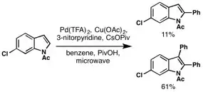 Fagnou's group showed that direct C-H arylation of an indole is possible using palladium catalysis with a copper oxidant.[14] Although the reaction requires high temperature, acidic solvent, and solvent quantities of the coupling partner, this demonstration of a selective and direct hetero aryl-aryl coupling is notable.