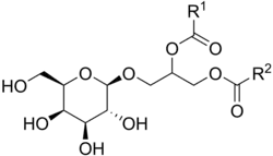 Galactolipids are more bioavailable than free fatty acids, and have been shown to exhibit COX mediated anti-inflammatory activity.[3] Bio-guided fractionation of spinach leaves (Spinacia oleracea) revealed alpha-linolenic acid galactolipids (18:3, n-3) were responsible for inhibitory effects on tumor promoter-induced Epstein-Barr virus (EBV) activation.[4] Recently, it has been demonstrated that this same galactolipid, 1,2-di-O-α-linolenoyl-3-O-α-D-galactopyranosyl-sn-glycerol,[5] may be important for the anti-inflammatory activity of Dog Rose (Rosa canina), a medicinal plant with documented effect on inflammatory diseases such as arthritis.
