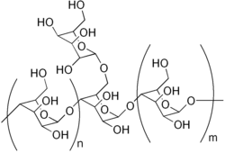 Galactomannans are polysaccharides consisting of a mannose backbone with galactose side groups, more specifically, a (1-4)-linked beta-D-mannopyranose backbone with branchpoints from their 6-positions linked to alpha-D-galactose, (i.e. 1-6-linked alpha-D-galactopyranose).