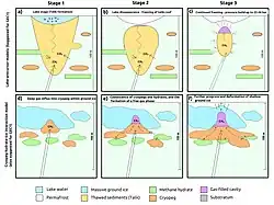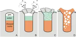 Subsequently, however, in the course of scientific research, the scientific community has come to the general conclusion that the crater was formed as a result of the so-called gas release – an underground explosion of methane hydrates which ejects into the air all the rock and soil above it (along with releasing the methane itself).[10][1][2][3] More specifically, their formation most likely occurs under the influence of fluid-dynamic processes in permafrost, which lead to the appearance of zones of accumulation of free natural gas near the surface. In this case, when the reservoir pressure of the accumulated gas fluids exceeds the pressure of the overlying strata, an avalanche-like outburst of gas-saturated rocks may occur. While thawing can promote methane release it has also been suggested that surface ice-melt water can migrate downward propelled by osmotic pressure associated to the concentration difference with a cryopeg, a lens of high-salinity water below, working as a mechanism for the accumulation of overpressure driving explosions.[11][12]