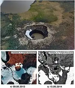 A gas emissions crater or GEC is a crater that is left by an explosion that is believed to be caused by an overheated buildup of gas stuck below a layer of permafrost.[1] The gas is methane (also known as "natural gas") and is generally believed by experts to have sept up from large underground reserves toward the Earth's surface "through some kind of geological fault,"[1] getting trapped when they reach the bottom of the permafrost.[1][2][3] First known to have occurred in 2013, they are occurring solely in Siberia, where there are large stores of natural gas below a melting surface layer of permafrost.[1] They are believed to be a byproduct of global climate change, since the warming of Siberia's climate weakens the permafrost enough to allow a sub-surface methane buildup to cause an outburst.[1][4] The release of this previously trapped methane into the atmosphere is also likely to increase the speed of global climate change.[1]
