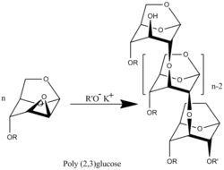 Poly(2-3)-D-glucose was synthesized proceeds by transformation of benzyl (R= -CH2C6H5) functionalized polymer.[8]