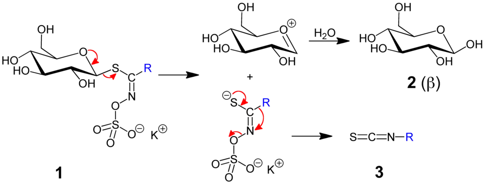 In the chemical reaction illustrated above, the red curved arrows in the left side of figure are simplified compared to reality, as the role of the enzyme myrosinase is not shown. However, the mechanism shown is fundamentally in accordance with the enzyme-catalyzed reaction.