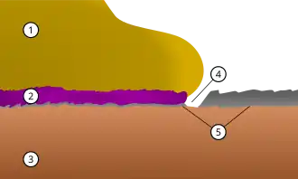 A schematic cross-section of a purple plague in a wire-bond of gold wire on an aluminium pad. (1) Gold wire (2) Purple plague (3) Copper substrate (4) Gap eroded by wire-bond (5) Aluminium contact