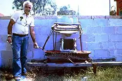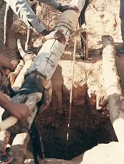 Also called a cradle, a rocker box uses riffles located in a high-walled box to trap gold in a similar manner to the sluice box. A rocker box uses less water than a sluice box and is well suited for areas where water is limited. A rocking motion provides the water movement needed for the gravity separation of gold in placer material.[45] Rocker boxes gained popularity during the California Gold Rush in the 19th century and remain in use today.[45][50] Although simple and inexpensive, it is not efficient as the previously discussed mining techniques.[45][51]