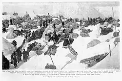 Also known as the Yukon Gold Rush, brought prospectors from around the world to the Klondike region of the Yukon territory in Canada.[30][31] The Klondike Gold Rush began in 1896, when gold was discovered in Bonanza Creek, a tributary of the Klondike River by George Carmack and his Indigenous companions, Skookum Jim Mason and Tagish Charlie.[32] As prospectors arrived in Klondike, makeshift towns and settlements sprang up along the rivers, including Dawson City, which because the largest town in Yukon at the height of the gold rush.[33] Prospectors employed various mining techniques to extract gold from the Klondike's streams and riverbeds, including placer mining, dredging, and hydraulic mining.[33]