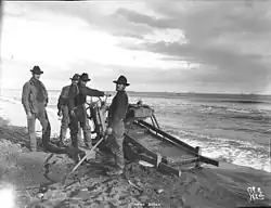 Four men using rocker boxes to mine for gold on Nome beach, Alaska.