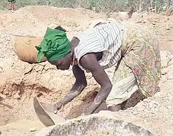 Evidence suggests that Nubia had sporadic access to gold nuggets during the Neolithic and Prehistoric Period.[6] Gold mining in Egypt involved both surface mining such as panning for gold in riverbeads and underground mining, where tunnels were dug to extract gold-bearing quartz veins.[6] During the Bronze Age, sites in the Eastern Desert became a great source of gold-mining for nomadic Nubians, who used "two-hand-mallets" and "grinding ore extraction." By the Old Kingdom, the oval mallet was introduced for mining. By the Middle Kingdom, stone mortars to process ores and a new gold-washing technique were introduced. During the New Kingdom, Nubian mining expanded under Egyptian occupation with the invention of the grinding mill.[6][7] Additionally, gold was associated with the sun god Ra and was believed to be eternal and indestructible, symbolising the pharaoh's divine power and afterlife.[8] Gold has also been found in the tombs of Tutankhamun and other pharaohs.[9]