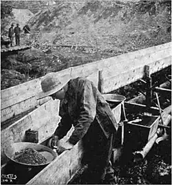 Using a sluice box to extract gold from placer deposits has long been a very common practice in prospecting and small-scale mining. Sluices work on the principle that heavier particles will sink to the bottom of a stream, while those that are lighter will be carried downstream and expelled.[45][46] A sluice box is essentially a man made channel with riffles set in the bottom. The riffles are designed to create dead zones in the current to allow gold to drop out of suspension.[45][46] The box is placed in the stream to channel water flow. Gold-bearing material is placed at the top of the box. The material is carried by the current through the volt where gold and other dense material settles out behind the riffles. Less dense material flows out of the box as tailings.[45][46]