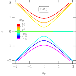 A vast family of cousins of the above ribbons with both similar edges is the class of ribbons combining non-equivalent edge geometries in a single ribbon. One of the simplest examples can be a half-bearded nanoribbon. Such ribbons, in principle, could be more stable than nanoribbons with two bearded edges because they could be realized via asymmetric hydrogenation of zigzag ribbons.[43] In the nearest neighbor tight-binding model and in non-spin-polarized density functional theory calculations such ribbons exhibit chiral anomaly structure.[42] The fully flat band of a pristine half-bearded nanoribbon subjected to the in-plane external electric field demonstrates unidirectional linear dispersions with group velocities of opposite directions around each of the two Dirac points. At high fields, the linear bands around the Dirac points transform into a wiggly cubic-like dispersions. This nontrivial behavior is favorable for the field-tunable dissipationless transport. The drastic transformation from fully flat to linear and then cubic-like band allows for a continuum model description based on the Dirac equation.[44] The Dirac equation supplemented with the suitable boundary conditions breaking the inversion/mirror symmetry and a single field strength parameter admits an analytic solution in terms of Airy-like special functions.