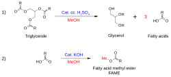 Lipids (triglycerides) themselves can be used as solvents, but are mostly hydrolyzed to fatty acids and glycerol (glycerin). Fatty acids can be esterified with an alcohol to give fatty acid esters, e.g., FAMEs (fatty acid methyl esters) if the esterification is performed with methanol. Usually derived from natural gas or petroleum, the methanol used to produce FAMEs can also be obtained by other routes, including gasification of biomass and household hazardous waste. Glycerol from lipid hydrolysis can be used as a solvent in synthetic chemistry, as can some of its derivatives.[8]