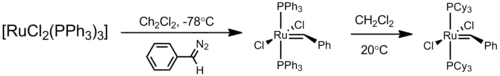 This initial ruthenium catalyst was followed in 1995 by what is now known as the first-generation Grubbs catalyst. It is synthesized from RuCl2(PPh3)3, phenyldiazomethane, and tricyclohexylphosphine in a one-pot synthesis.[8][9]