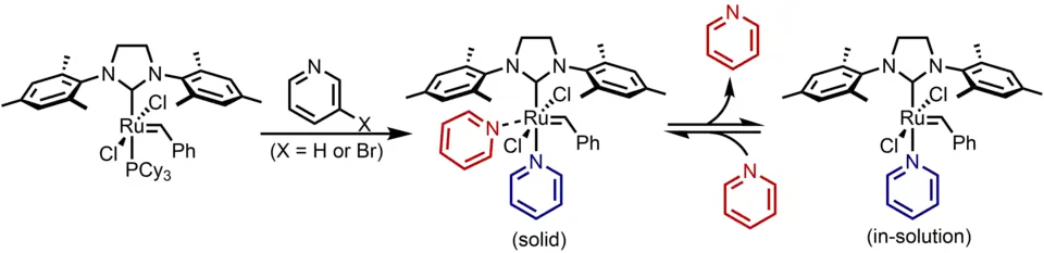 The rate of the Grubbs catalyst can be altered by replacing the phosphine ligand with more labile pyridine ligands. By using 3-bromopyridine the initiation rate is increased more than a millionfold.[21] Both pyridine and 3-bromopyridine are commonly used, with the bromo- version 4.8 times more labile resulting in even faster rates.[22] The catalyst is traditionally isolated as a two pyridine complex, however one pyridine is lost upon dissolving and reversibly inhibits the ruthenium center throughout any chemical reaction.