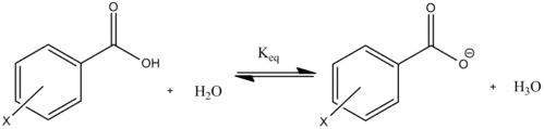 The Hammett equation (Equation 1) provides the relationship between the substituent on the benzene ring and the ionizing rate constant of the reaction. Hammett used the ionization of benzoic acid as the standard reaction to define a set of substituent parameters σX, and then to generate the ρ values, which represent ionizing abilities of different substrates. This relationship can be visualized through a Hammett plot.