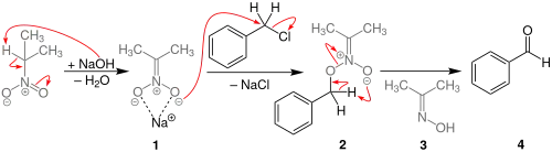 The reaction process begins with the deprotonation of 2-nitropropane at the α carbon to form a nitronate. This compound then initiates an SN2 reaction to displace the benzyl halide. Unlike in the nitroaldol reaction, where the deprotonated carbon of the nitroalkyl group is the nucleophilic atom, it is instead an oxygen of the nitro itself that attacks the benzylic carbon.[4] The O-benzyl structure then undergoes a pericyclic reaction to produce a benzaldehyde, with dimethyloxime as a byproduct.