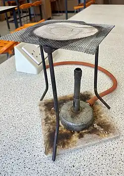 A heatproof mat is a piece of apparatus commonly used in tabletop lab experiments that involve moderate temperatures (for example, when a Bunsen burner is being used) to prevent damage to a work surface.[1] They may also be used for domestic equipment, such as hot plates,[2] hair stylers,[3] hair straighteners[4] or other hot objects.