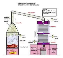 Herbal distillates are produced in the same or similar manner as essential oils. However, essential oils will float to the top of the distillate where it can be removed, leaving behind the watery distillate. For this reason, the term essential water is an apt description. In the past, these essential waters were often considered a byproduct of distillation, but are now considered an important co-product.[8] The produced herbal waters are essentially diluted essential oils at less than 1% concentration (typically 0.02% to 0.05%).[9] Several factors, such as temperature and a herb's growth cycle, impact the characteristics of a distillate, and therefore influence the timing of the distillation. Rosemary, for example, should be distilled in the peak of summer before it flowers.[10]