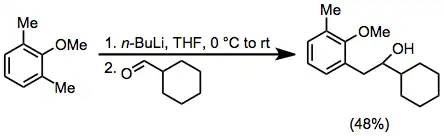 Sulfonamides require two equivalents of an organolithium reagent for lateral lithiation, but represent a useful class of directing groups. Treatment with ketones leads to tertiary alcohols in high yield.[16]