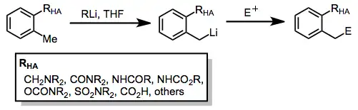 Heteroatom-promoted lateral lithiation is the site-selective replacement of a benzylic hydrogen atom for lithium for the purpose of further functionalization. Heteroatom-containing substituents may direct metalation to the benzylic site closest to the heteroatom or increase the acidity of the ring carbons via an inductive effect.[1]