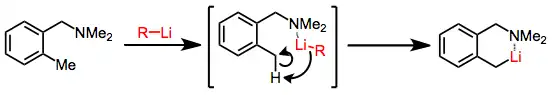 When both the Lewis acidity of the organolithium compound and the Lewis basicity of the substituent are high, as in lithiations of ortho-(dialkylamino)methyl toluenes with n-butyllithium in a non-coordinating solvent, coordination of the base to the heteroatom substituent takes place. Lithiation then occurs at the most kinetically accessible ortho benzylic position; ortho lithiation is slower in this case.[2]