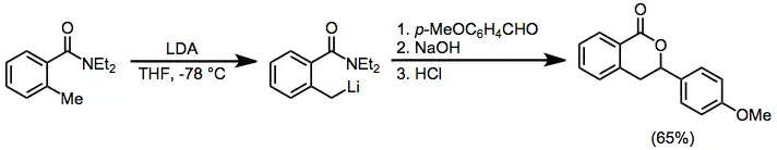Tertiary amides are highly effective directing groups. After treatment of the resulting benzylic anion with an aldehyde, cyclization leads to lactones.[12] Carboxamides, in which the amide is attached to the aromatic ring through nitrogen rather than carbon, are also effective directing groups.[13]