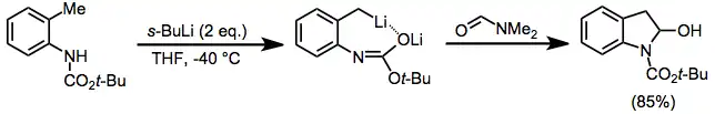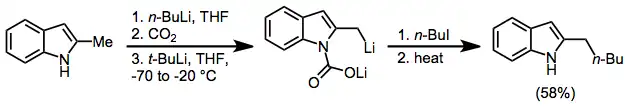 Convenient generation of a directing group on the nitrogen of indoles is possible through treatment with an organolithium reagent and carbon dioxide.[17] A similar method can be applied for lateral lithiations of ortho-tolyl anilines.[18]
