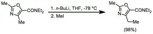 Oxazoles containing two methyl groups exhibit interesting selectivity patterns. In the absence of a directing substituent, the methyl group closer to the more electronegative oxygen atom is selectively metalated. However, in the presence of a directing substituent, the director fully controls the site of lithiation.[19]