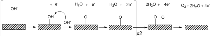 Heterogeneous OER is sensitive to the surface in which the reaction takes place and is also affected by the pH of the solution. The general mechanism for acidic and alkaline solutions is shown below. Under acidic conditions water binds to the surface with the irreversible removal of one electron and one proton to form a platinum hydroxide.[4] In an alkaline solution a reversible binding of hydroxide ion coupled to a one electron oxidation is thought to precede a turnover-limiting electrochemical step involving the removal of one proton and one electron to form a surface oxide species.[5] The shift in mechanism between the pH extremes has been attributed to the kinetic facility of oxidizing hydroxide ion relative to water. Using the Tafel equation, one can obtain kinetic information about the kinetics of the electrode material such as the exchange current density and the Tafel slope.[6] OER is presumed to not take place on clean metal surfaces such as platinum, but instead an oxide surface is formed prior to oxygen evolution.[7]