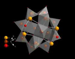 The structure of some POMs are derived from a larger POM's structure by removing one or more addenda atoms and their attendant oxide ions, giving a defect structure called a lacunary structure. An example of a compound with a Dawson lacunary structure is As2W15O56.[6] In 2014, vanadate species with similar, selective metal-binding properties were reported.[7]