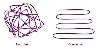 Polymers contain different morphologies on the molecular level which give rise to their macro properties. Long range disorder in the polymer chain is representative of amorphous solids, and the chain segments are considered amorphous. Long range polymer order is similar to crystalline material, and chain segments are considered crystalline.